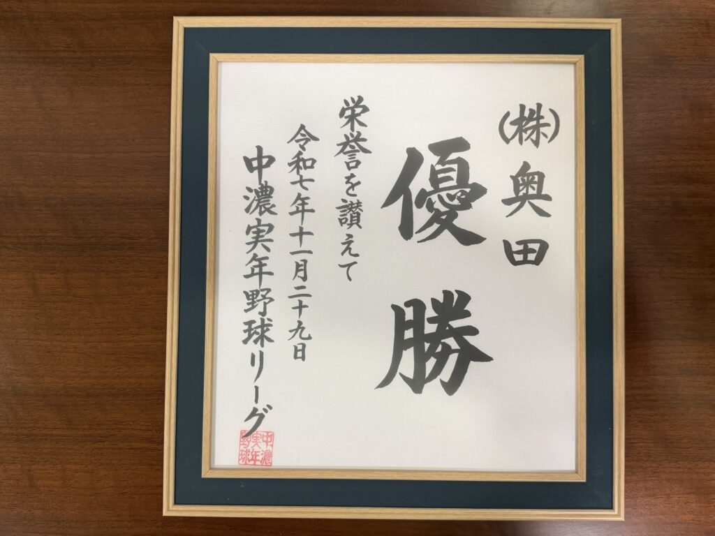 株式会社奥田は、昨年より関市実年野球連盟 Bリーグに登録し、年間を通して見事 優勝することができました🏆✨